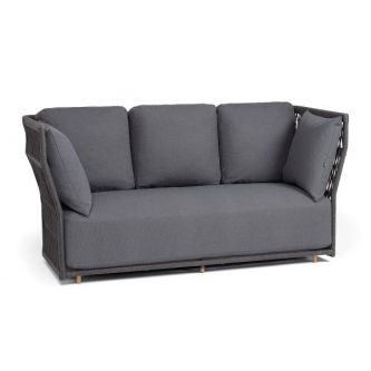 Диван имеет алюминиевый каркас, окрашенный порошковой краской в темно-серый цвет. Боковины каркаса и спинка вручную оплетены роупом - эластичными синтетическими лентами, изготовленными из высокопрочных полиэфирных волокон. Цвет оплетки в тон каркасу - темно-серый.