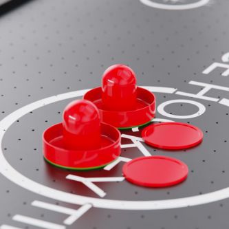 Игровое поле стола выполнено из качественного МДФ с бумажным покрытием, что гарантирует гладкую поверхность для легкого скольжения шайбы. Толщина поля 3 мм, бортики высотой 15,5 мм и толщиной 12 мм защищают шайбу от вылета, обеспечивая комфорт и безопасность игры. Основание стола изготовлено из МДФ с ПВХ-покрытием, что делает конструкцию долговечной и устойчивой к износу.