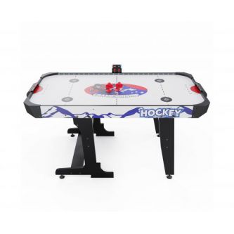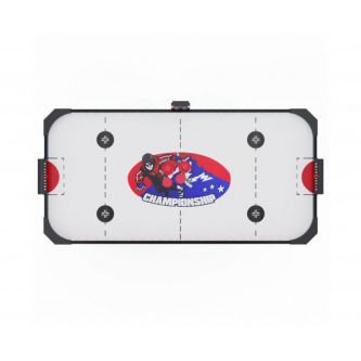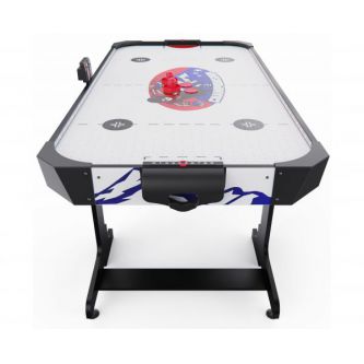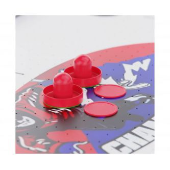 Игровое поле стола выполнено из качественного МДФ с покрытием ПВХ и бумажным слоем, что обеспечивает гладкую поверхность для лёгкого скольжения шайбы и повышает износостойкость конструкции. Толщина поля 3 мм, бортики высотой 25 мм и толщиной 12 мм защищают шайбу от вылета, обеспечивая комфорт и безопасность игры, а высота ножек 71 см делает стол удобным для игроков разного возраста.