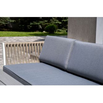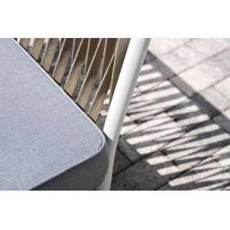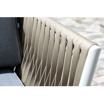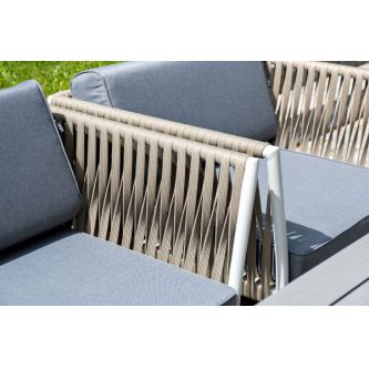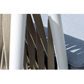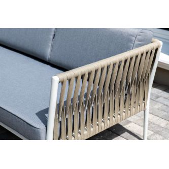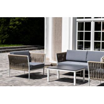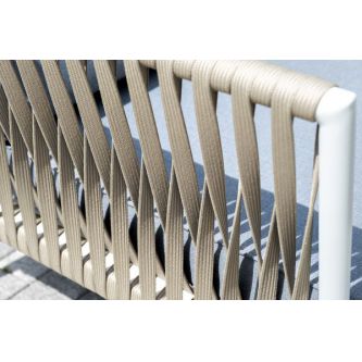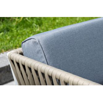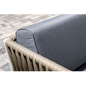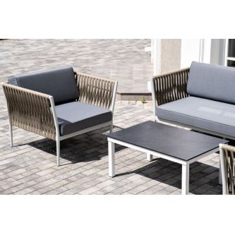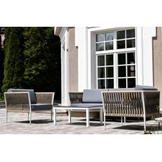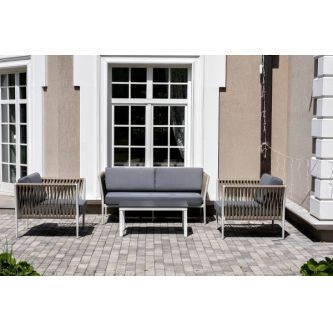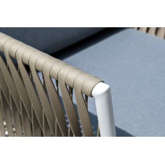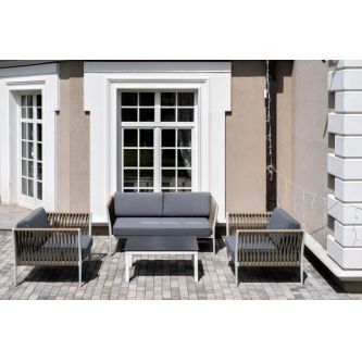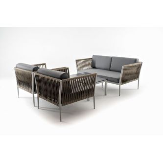Диван и кресла изготовлены их алюминиевого прочного каркаса, оплетенного ручным способом роупом серо-коричневого цвета. Это эластичные ленты из полиэфирных волокон высокого качества.