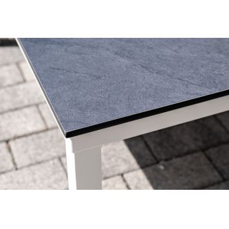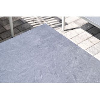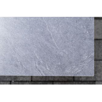 Журнальный столик также имеет алюминиевый каркас белого цвета. Столешница выполнена из монолитного компакт-пластика HPL цвета "серый гранит".