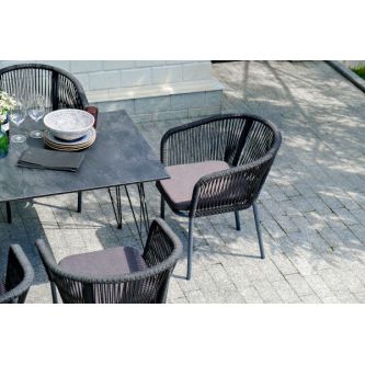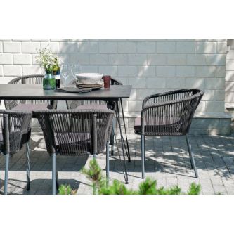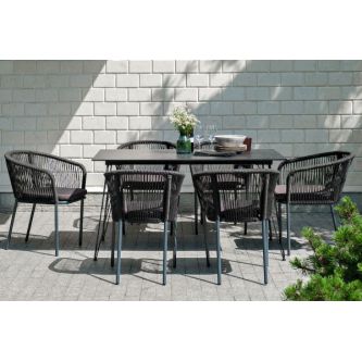 Каркас стульев - алюминиевый, оплетен вручную современным материалом - роупом. Это эластичные синтетические ленты из высокопрочных полиэфирных волокон. В комплект входят подушки со съёмными водоотталкивающими чехлами серого цвета.