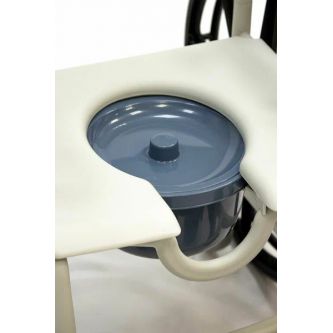 Данная модель оснащена пластиковым съемным санитарным судном, которое спрятано под сиденьем. Оно легко моется, а одноразовые гигиенические пакеты делают уход за больным еще проще. В случае необходимости судно может быть снято, а стул размещен сверху унитаза. Кроме того, кресло имеет ручку на спинке, которая предназначена для перемещения пациента сопровождающим. Подножки кресла-туалета можно снять.