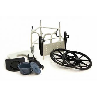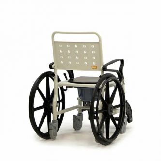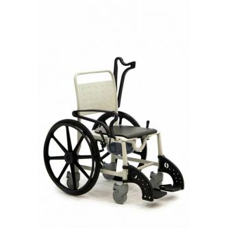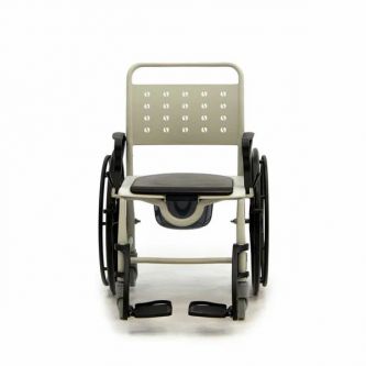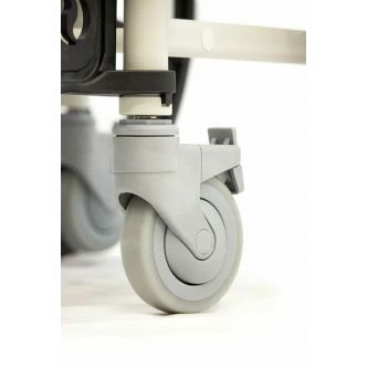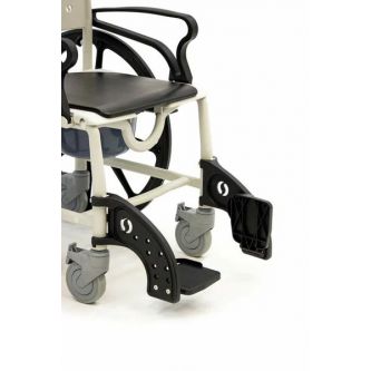 Кресло-коляска имеет 4 маленьких и 2 больших задних съемных колеса. Большие колёса позволяют пользователю передвигаться на стуле без посторонней помощи. Тормоза на каждом колесе позволяют зафиксировать кресло на месте, если это необходимо. Подножки кресла-туалета можно снять.