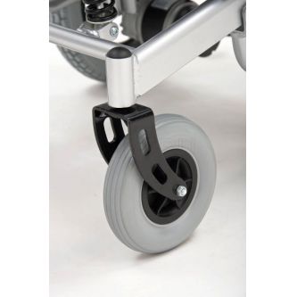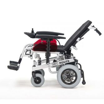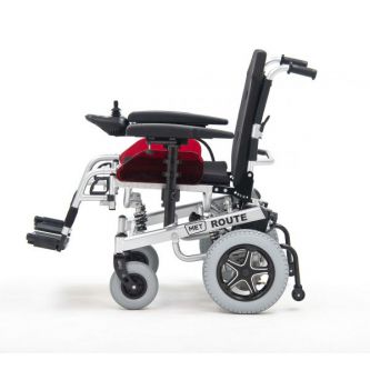 Передние литые колеса MET ROUTE 14 не боятся проколов. Задние колеса – накачиваются для мягкости хода. Сочетание колес с подвеской обеспечивает маневренность и высокую проходимость. Конструктив электроколяски дает возможность въезда на поверхность с углом наклона до 12 градусов, а наличие антиопрокидывателей обеспечивает безопасность.