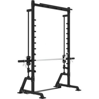 Машина Смита представляет собой силовой тренажёр с массивной стальной рамой чёрного цвета, предназначенный для безопасных и эффективных тренировок. Конструкция выполнена в виде устойчивой прямоугольной рамы с двумя основными вертикальными направляющими, по которым движется гриф, и множеством уровней фиксации по всей высоте стоек, что позволяет устанавливать стартовое и конечное положение штанги на разных уровнях.