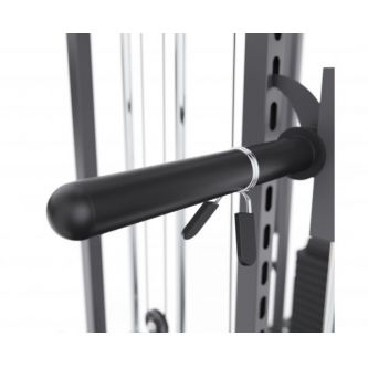 Тренажёр оснащён верхними и нижними блоками, а также набором рукоятей: прямая, V-образная, манжета для ног и дополнительные адаптеры. Система тросов использует тросы длиной 60 см и диаметром 5 мм, оснащённые пружинами и фиксаторами, что обеспечивает плавный ход, точную регулировку нагрузки и долговечность в условиях интенсивной эксплуатации. На стойках расположены держатели для весовых пластин, а встроенный гриф имеет длину 80 см и толщину 5 мм, что обеспечивает удобную загрузку дисков и стабильную работу при выполнении упражнений.