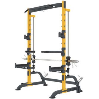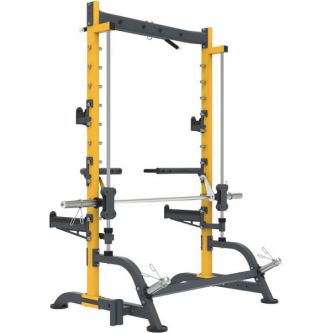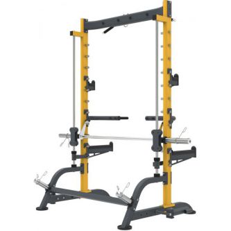Машина Смита представляет собой силовой тренажёр с прочной стальной рамой, выполненной в жёлто-чёрной цветовой гамме. Конструкция имеет устойчивую П-образную форму и оснащена двумя основными вертикальными направляющими, по которым перемещается фиксированный гриф. По всей высоте стоек расположено множество уровней фиксации, позволяющих точно настраивать рабочую высоту штанги под различные упражнения и рост пользователя.