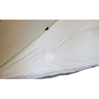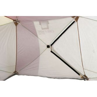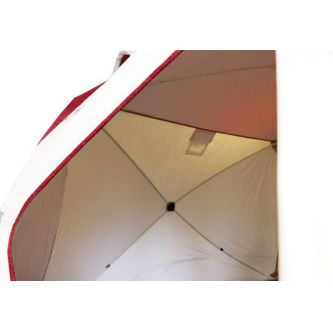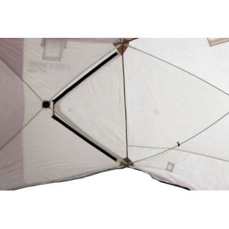 Стены палатки изготовлены из двух слоев водоотталкивающей ткани Oxford 240D с полиуретановым покрытием, между которыми находится толстый слой утеплителя, синтепона плотностью 150г/м2. Светлые ткани, используемые на внутренней части стен, обеспечивают отличную видимость внутри палатки, даже без открытия шторок на окнах. Каркас изготовлен из надежных пластиковых хабов и стеклокомпозитных материалов собственного производства, обладающих повышенной прочностью и жесткостью, благодаря чему палатке не страшен самый сильный ветер.