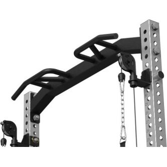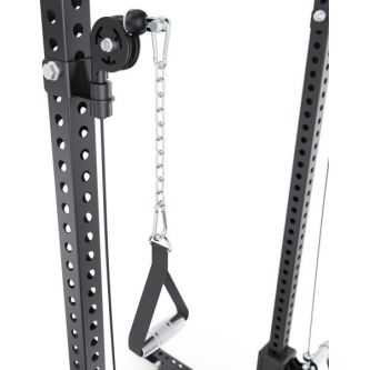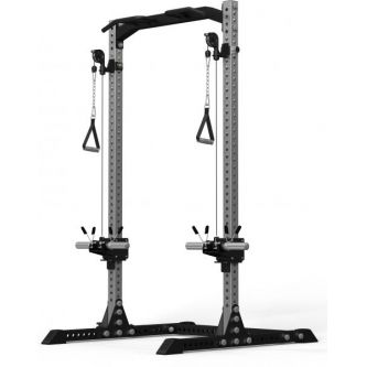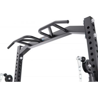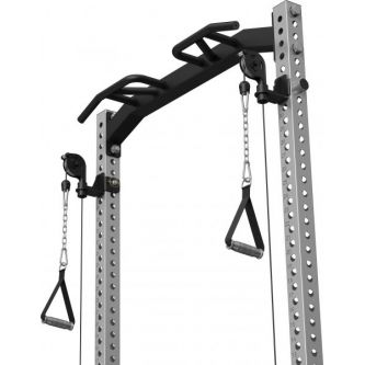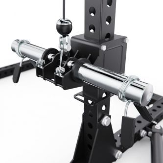 Встроенный кроссовер расширяет функциональность тренажера и позволяет прорабатывать все основные группы мышц. Кроме того, с одной стороны рамы предусмотрено специальное отверстие для установки грифа, которое позволяет использовать раму как Лэндмайн, выполняя жим и другие упражнения с естественной амплитудой движения.