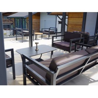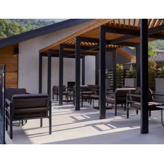 В комплекте на сидениях и спинке предусмотрены подушки контрастного темно-серого оттенка со съёмными чехлами. Строгое лаконичное кресло подходит для использования на открытом воздухе и в помещении, в том числе и в зоне повышенной влажности.