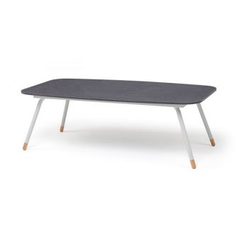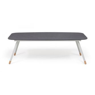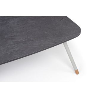 Каркас столика изготовлен из алюминия, окрашенного в светло-серый цвет. Алюминий является легким и прочным материалом, что обеспечивает долговечность и надежность изделия. На ножках столика идут дубовые наконечники (заглушки).