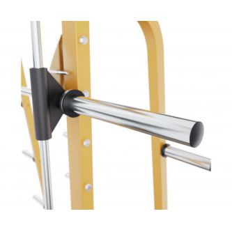 Каркас изготовлен из прочной стали с профилем 70 х 50 х 2 мм, что гарантирует устойчивость и долговечность конструкции. Машина оснащена встроенным грифом длиной 180 см с посадочным диаметром 50 мм и максимальной нагрузкой до 300 кг. Для хранения дисков предусмотрено 6 посадочных мест диаметром 50 мм, каждое из которых выдерживает нагрузку до 150 кг.