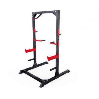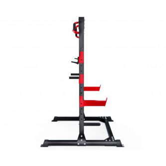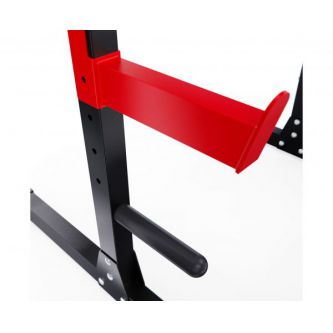 2 пары держателей для штанги регулируются на 12 уровней по высоте. Максимальная нагрузка на держатели штанги 150 кг. Для хранения дисков предусмотрены 2 держателя по углам тренажера длиной 25 см (диаметр 25 мм), а также переходная втулка (диаметр 50 мм). Максимальная нагрузка на каждый держатель для дисков 60 кг. Нескользящие ножки надежно устанавливаются на полу и не царапают поверхность.